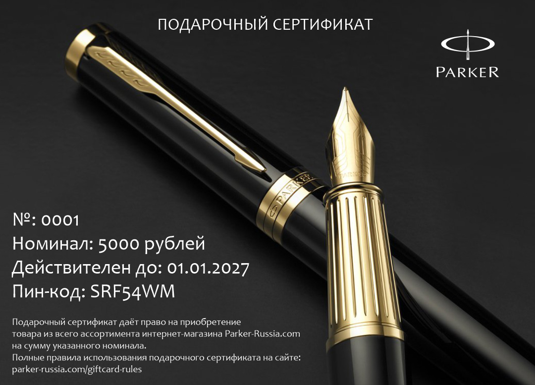 Подарочный сертификат Parker 5000 от официального дилера Parker в Ангарске. Вы можете дополнительно заказать гравировку, которая подчеркнет Вашу оригинальность и придаст памятность статусному подарку. Все ручки Паркер поставляются в фирменном футляре.