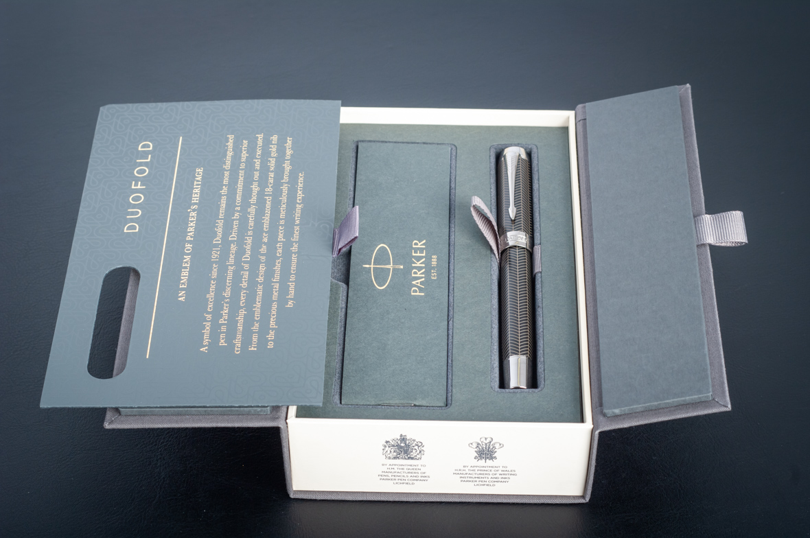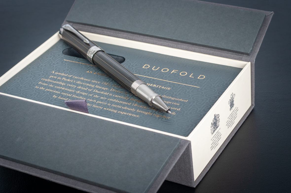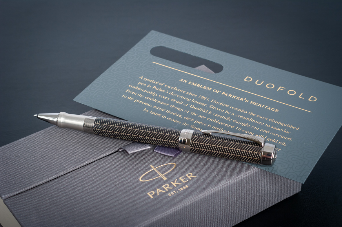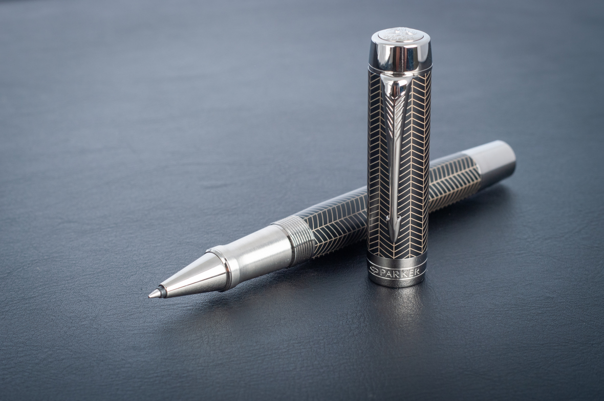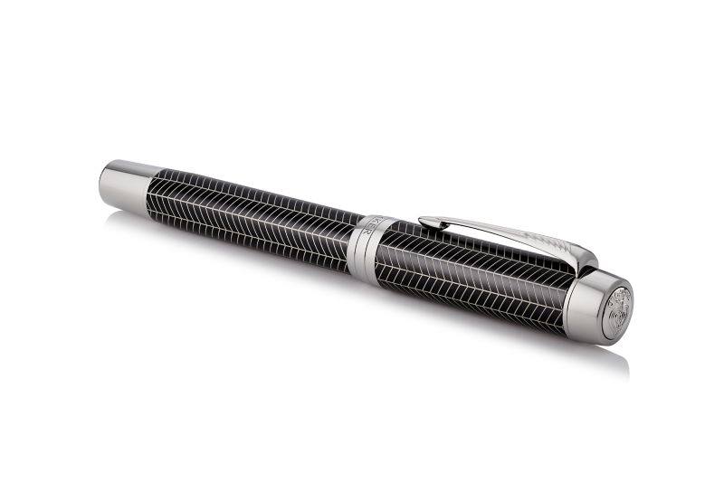 Ручка роллер Parker Duofold Prestige Centennial Black Chevron CT от официального дилера Parker в Ангарске. Вы можете дополнительно заказать гравировку, которая подчеркнет Вашу оригинальность и придаст памятность статусному подарку. Все ручки Паркер поставляются в фирменном футляре.